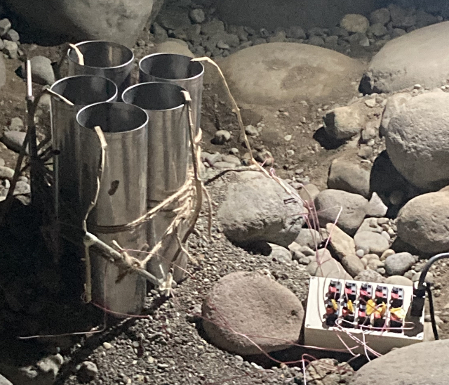 花火は 金属製の筒に導火線を繋いだ煙火玉を入れ、遠隔で着火 して打ち上げます。